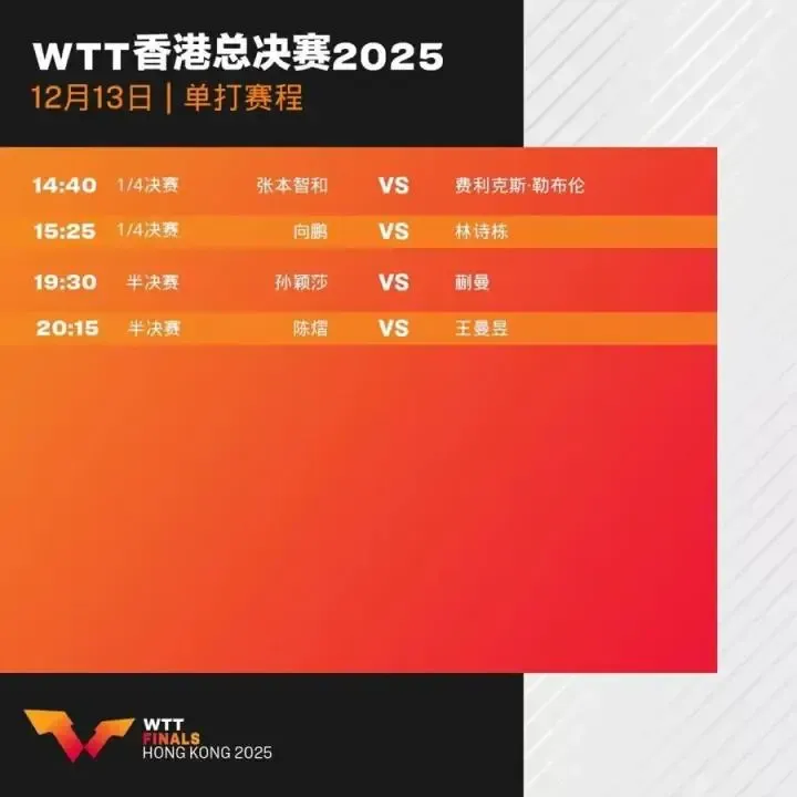 12月12日,WTT香港总决赛迎来多场焦点对决,国乒军团推崇亮眼。其中女单赛场尤为强势,孙颖莎、陈熠、蒯曼、王曼昱联袂晋级四强,提前包揽冠亚军。12月13日张开混双半决赛、女单半决赛及混双决赛,孙颖莎濒临一日三赛的“极限操作”,双线作战的体能分拨与气象切换成为严峻挑战。